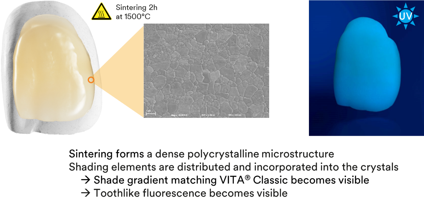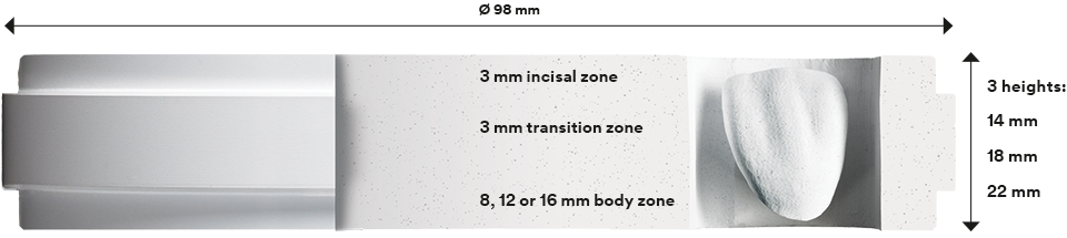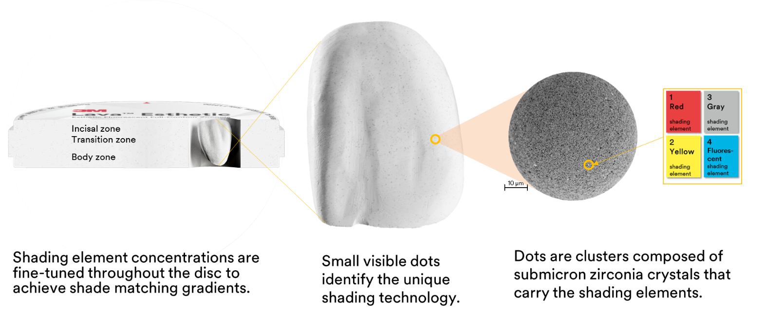 This means the zirconia blank, or puck, has shade gradients built into it to help attain correct shading with less technician time. Not all zirconias include this feature.