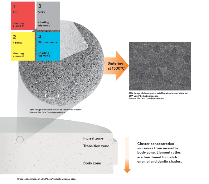 3M™ Lava™ Esthetic Zirconia discs are based on high purity zirconium dioxide stabilized with 5 mol% yttria. For shading, a newly developed four shading elements formula is utilized. Shading elements are carried by spherical microcrystalline clusters. These are visible as small dots in the disc and indicate the unique shading chemistry. True shade match is achieved by fine-tuning the ratio of the red, gray and yellow shading elements. Shade gradient is produced by varying the cluster concentration. Sintering at 1500°C produces a dense polycrystalline microstructure. Shading elements are uniformly distributed and built into the crystals to provide the desired color gradient and fluorescence.