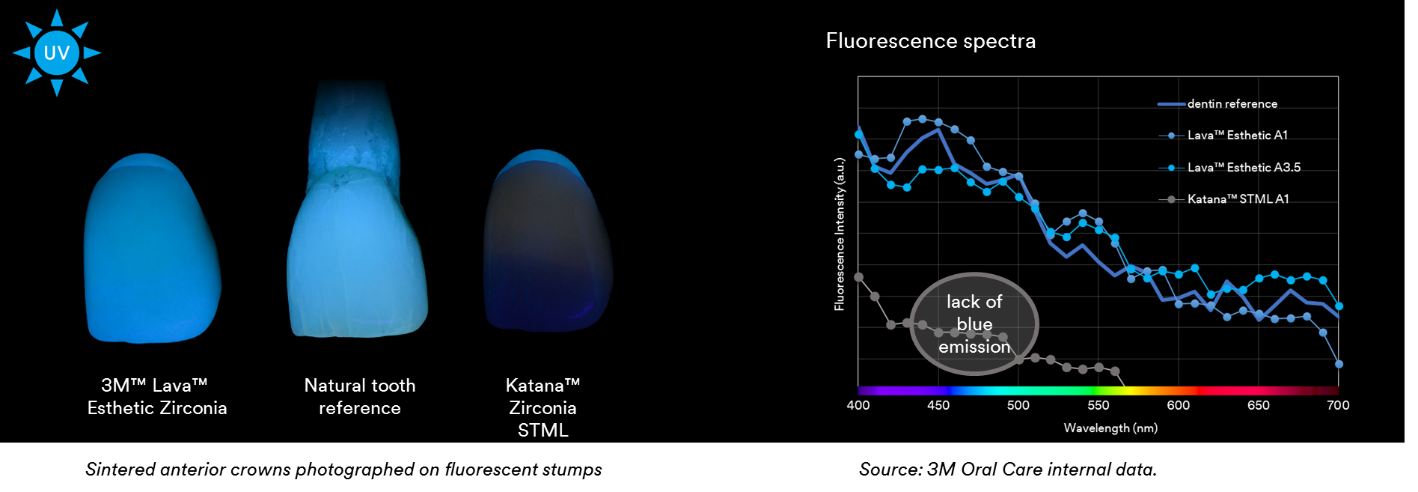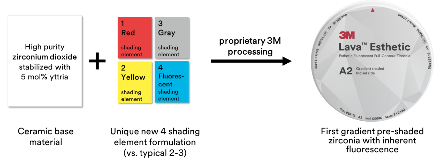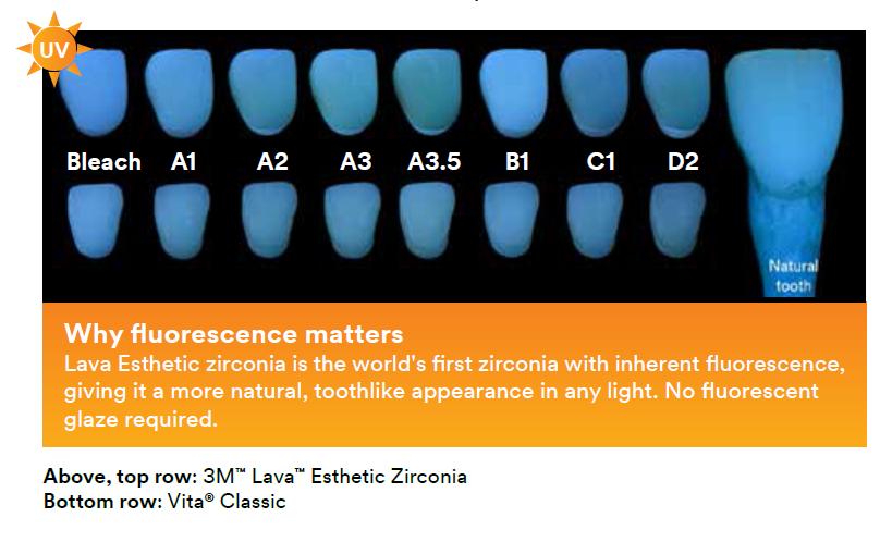 3M™ Lava™ Esthetic Fluorescent Full-Contour Zirconia is a new gradient pre-shaded cubic zirconia disc featuring a one-of-a-kind new shading technology: With its unique four shading elements formulation, it is the first pre-shaded zirconia offering inherent fluorescence for all shades. With the new shading technology employed, the color gradients built into Lava Esthetic zirconia truly match the VITA® Classic shades enabling you to produce highly esthetic full contour restorations.